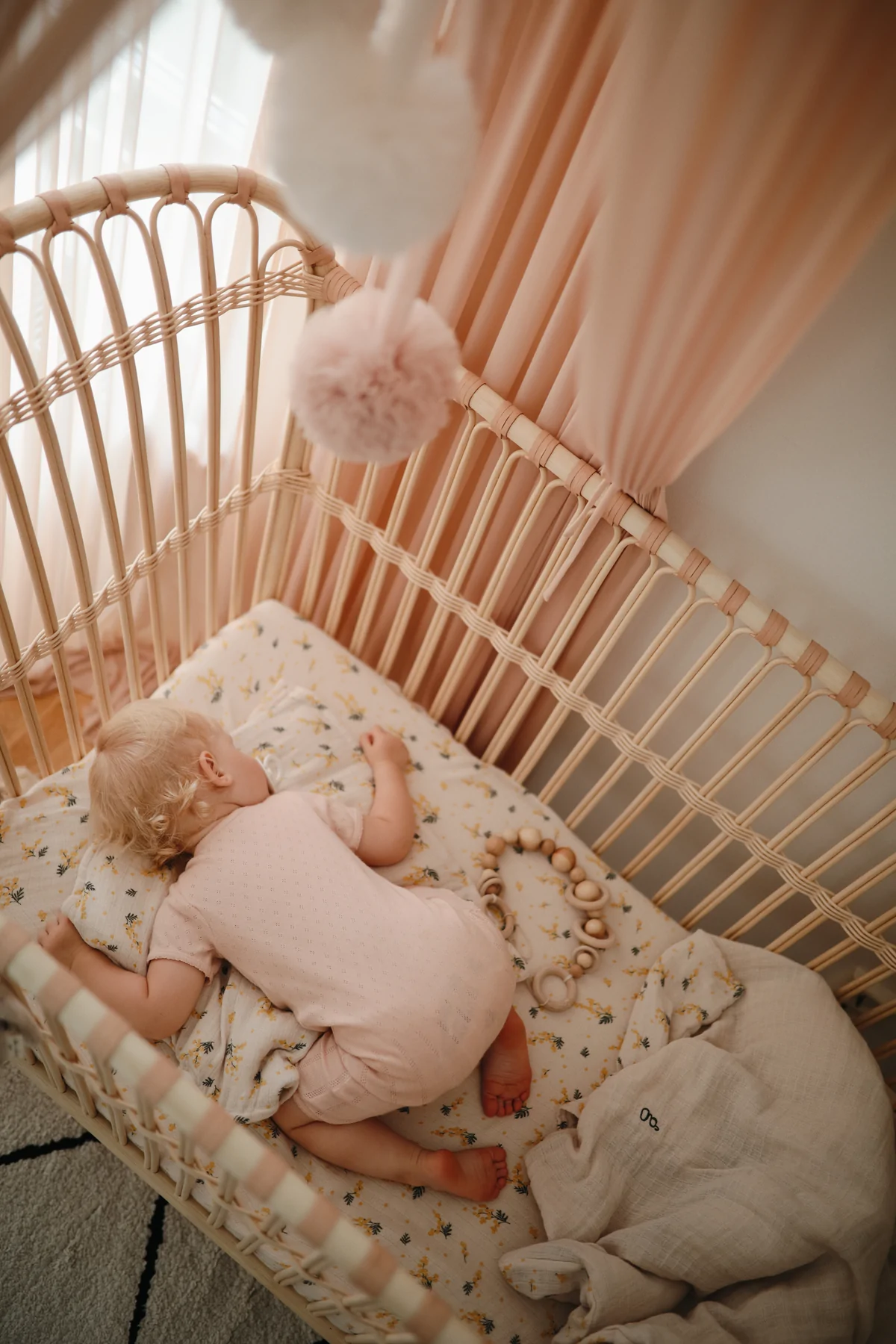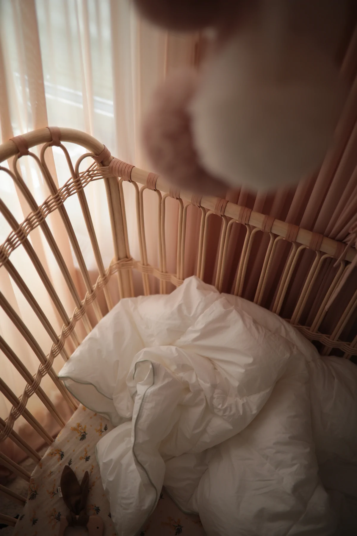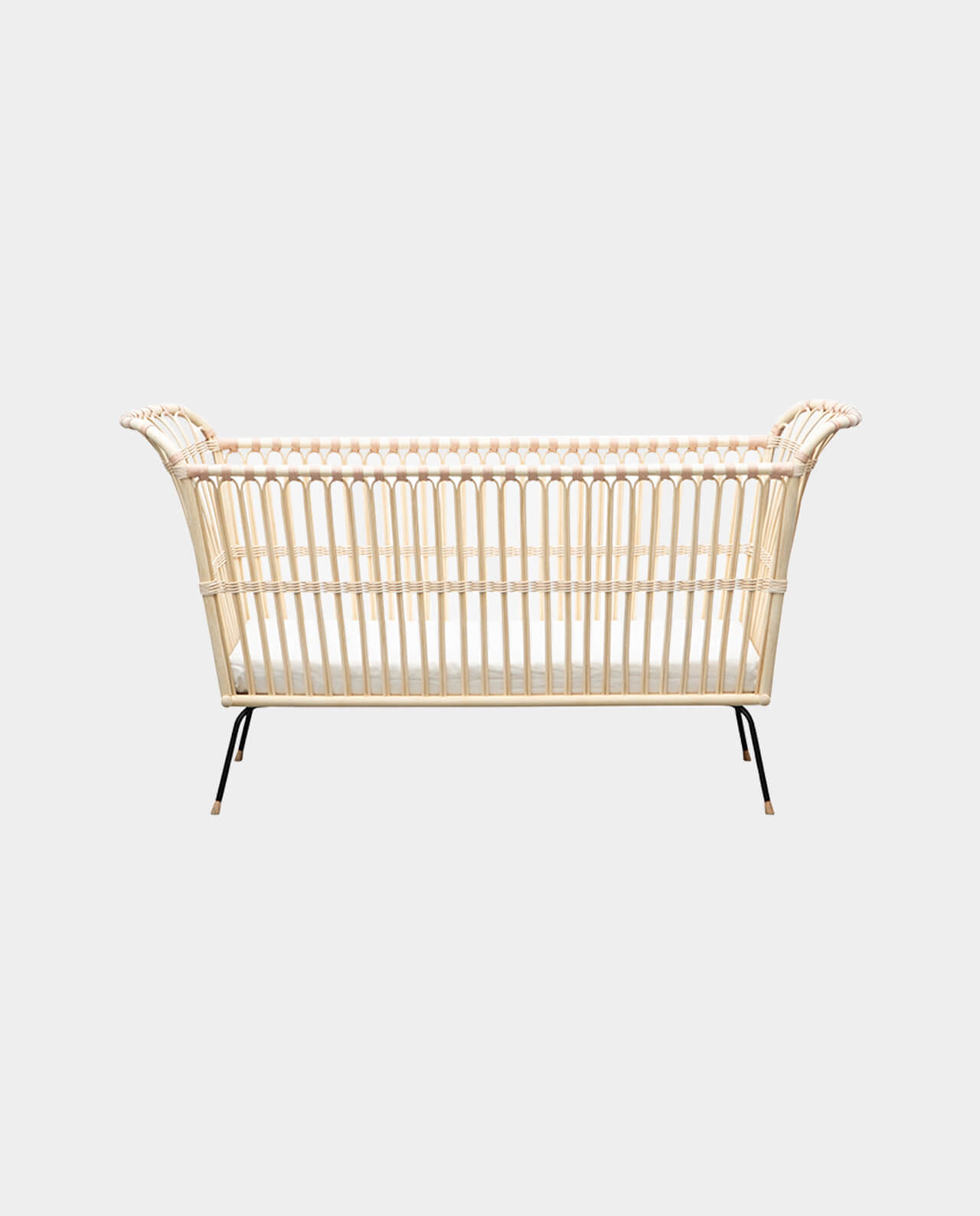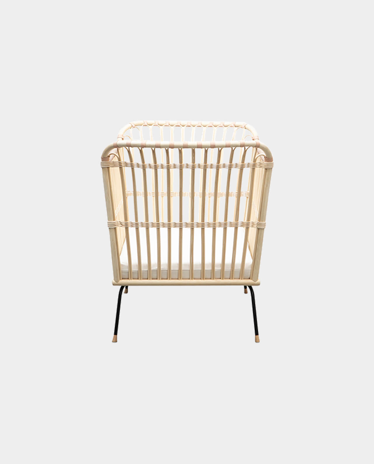 Babybett FREDERICK wirkt auf dem filigranen Metallgestell sehr leicht – beinahe schwebend. Der fein geflochtene Korb aus Rattan ist mit seinen verschiedenen Rohrdurchmessern und seinem einzigartigen Flechtmuster an Design kaum zu übertreffen. Es verleiht dem Babybett eine gewisse Transparenz. So hast du dein Baby bzw. Kind stets im Blick und dein Kind kann bereits seine Umgebung aus dem Bettchen heraus erkunden. Feine Riemchen aus pflanzlich gegerbtem Leder umschließen die einzelnen Verbindungen des Rattan-Geflechts und verleihen ihm zusätzliche Festigkeit. Die warmen natürlichen Farben von Rattan und Leder verbinden sich dabei zu einem einzigartigen Muster. Kleine Füße aus Mangoholz sorgen für eine gleichmäßige und schonende Bodenauflage.