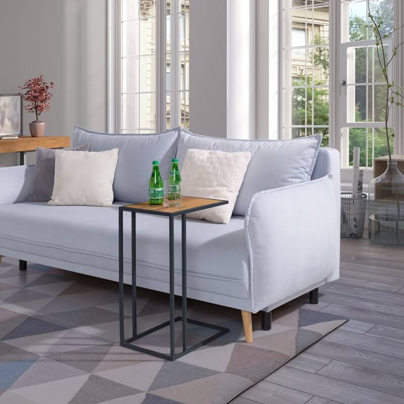 Beistelltisch VETA im modernen Design ist nicht nur ein Hingucker im Wohnzimmer, sondern auch sehr praktisch. Die wunderschöne dünne Tischplatte aus Eiche rustikal wird in das Metallgestell (Schwarz oder Weiß) detailgenau eingesunken. Damit bietet der Beistelltisch eine multifunktionale Ablage für Tablet, Zeitungen, Bücher oder Getränke. Die einzigartige Maserung des Holzes machen jeden Beistelltisch zu einem echten Unikat. Das geradlinige und schlichte Metallgestell aus quadratischen Profilen bewirkt, dass der Beistelltisch harmonisch und leicht wirkt.