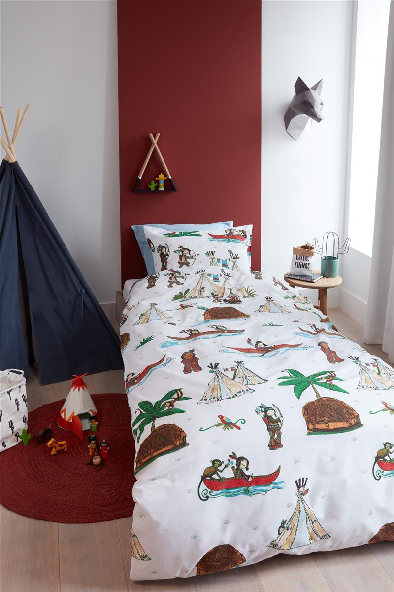 Indianer, Wigwams, Kajaks, Äffchen und exotische Vögel auf der Bettwäsche WIGWAM entführen in die aufregende Welt der Indianer. Die kleinen Figuren auf der süßen Kinder Bettwäsche sind von Hand gezeichnet. Sie kommen auf dem weißen Untergrund sehr schön zur Geltung. Die Bettwäsche besteht aus reiner Baumwolle in höchster Qualität. Der Bettbezug hat zudem einen praktischen Reißverschluss zum leichten Wechseln.