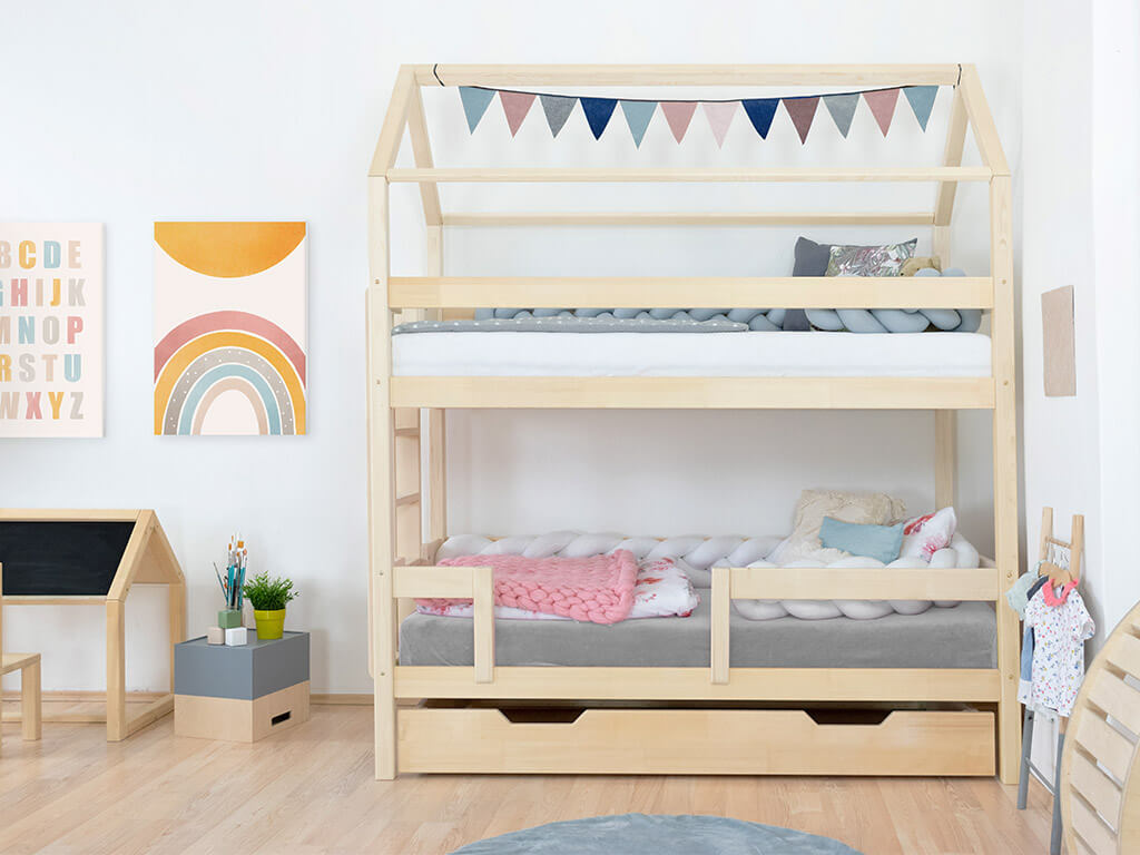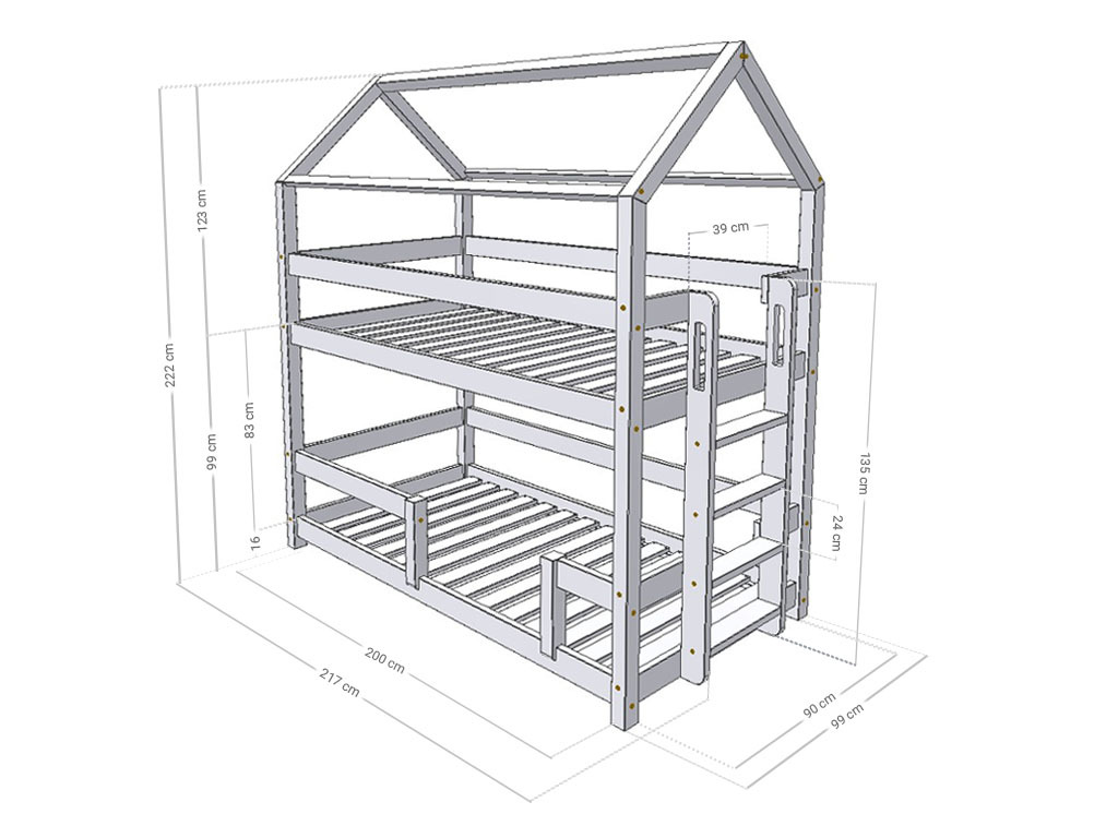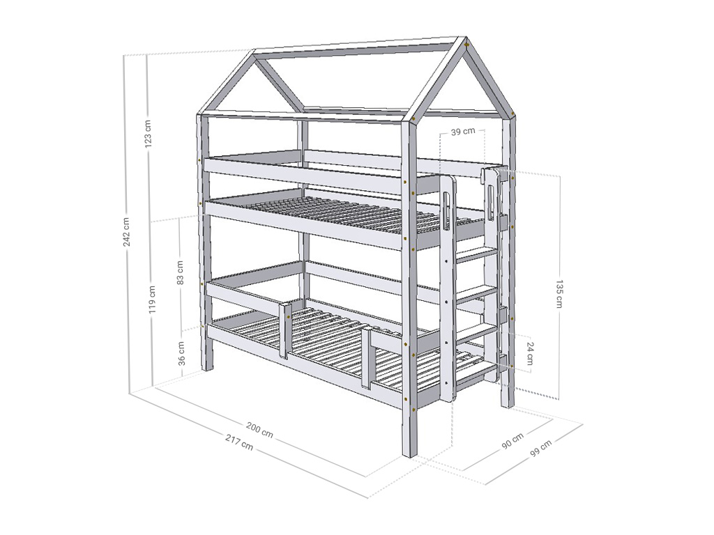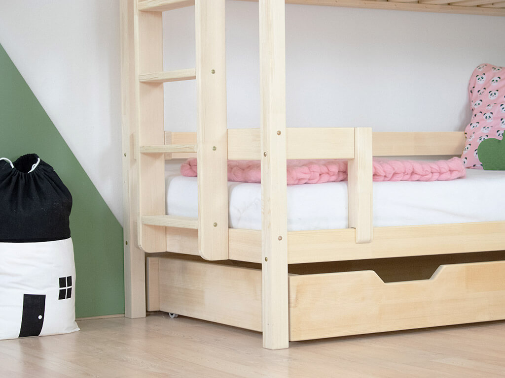 Dieses wundervolle Etagenbett bietet deinen Kindern alles was es braucht, um sich nachts richtig wohl zu fühlen. Das Doppelstockbett ist handgefertigt aus 6 cm dickem Vierkantholz. Es ist mit ökologischen Farben lackiert, die die Natur schützen und auch für Allergiker geeignet sind. Das Etagenbett kann pro Etage bis zu 150 kg tragen, so dass auch ein Elternteil zum Vorlesen der Gute-Nacht-Geschichte problemlos mit im Bett liegen kann. An der Seite des Bettes befindet sich einer Leiter, über die man bequem ins Bett steigen kann. Die Lieferung beinhaltet den Bettrahmen sowie zwei Lattenroste. Matratzen sind nicht inklusive. Wir empfehlen Matratzen mit einer Höhe von mind. 18cm. Die Leiter kann sowohl links als auch rechts vom Bett angebracht werden.