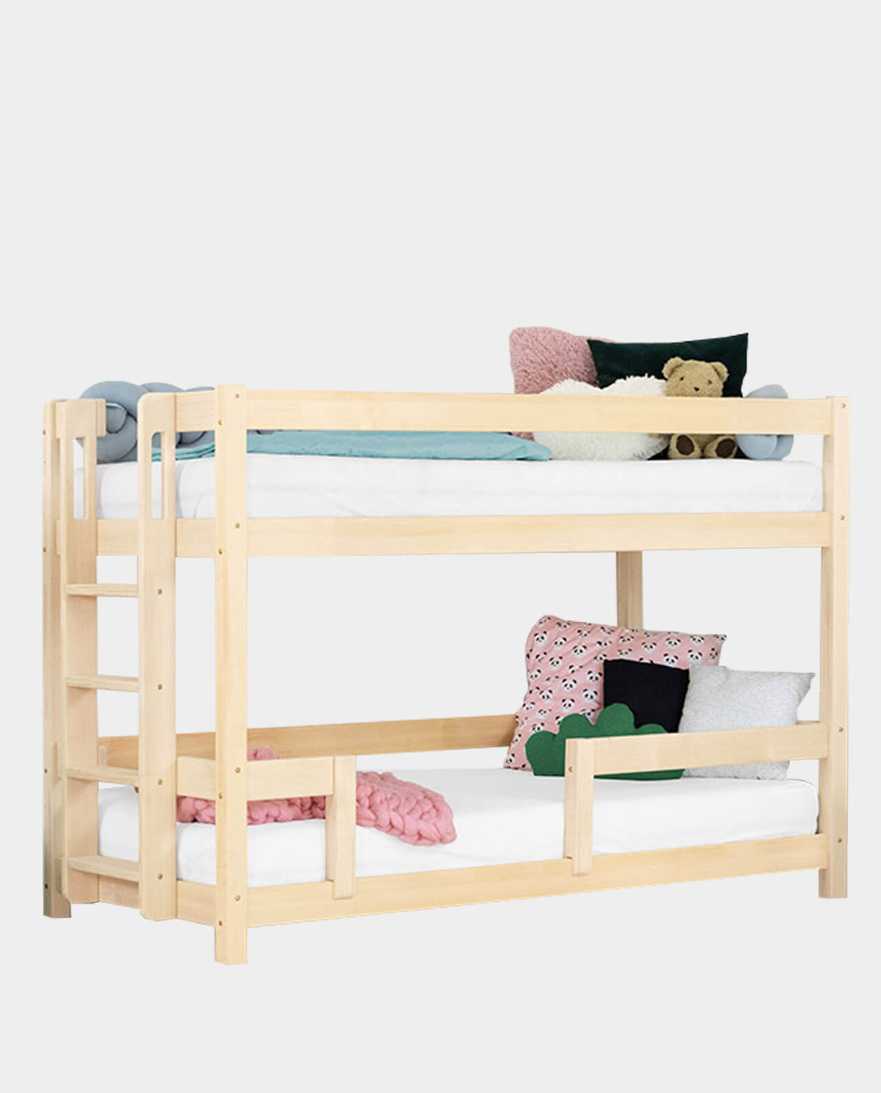 Dieses wundervolle Etagenbett bietet deinen Kindern alles was es braucht, um sich nachts richtig wohl zu fühlen. Das Doppelstockbett ist handgefertigt aus 6 cm dickem Vierkantholz. Es ist mit ökologischen Farben lackiert, die die Natur schützen und auch für Allergiker geeignet sind. Das Etagenbett kann pro Etage bis zu 150 kg tragen, so dass auch ein Elternteil zum Vorlesen der Gute-Nacht-Geschichte problemlos mit im Bett liegen kann. An der Seite des Bettes befindet sich einer Leiter, über die man bequem ins Bett steigen kann. Die Lieferung beinhaltet den Bettrahmen sowie zwei Lattenroste. Matratzen sind nicht inklusive. Wir empfehlen Matratzen mit einer Höhe von mind. 18cm. Die Leiter kann sowohl links als auch rechts vom Bett angebracht werden.