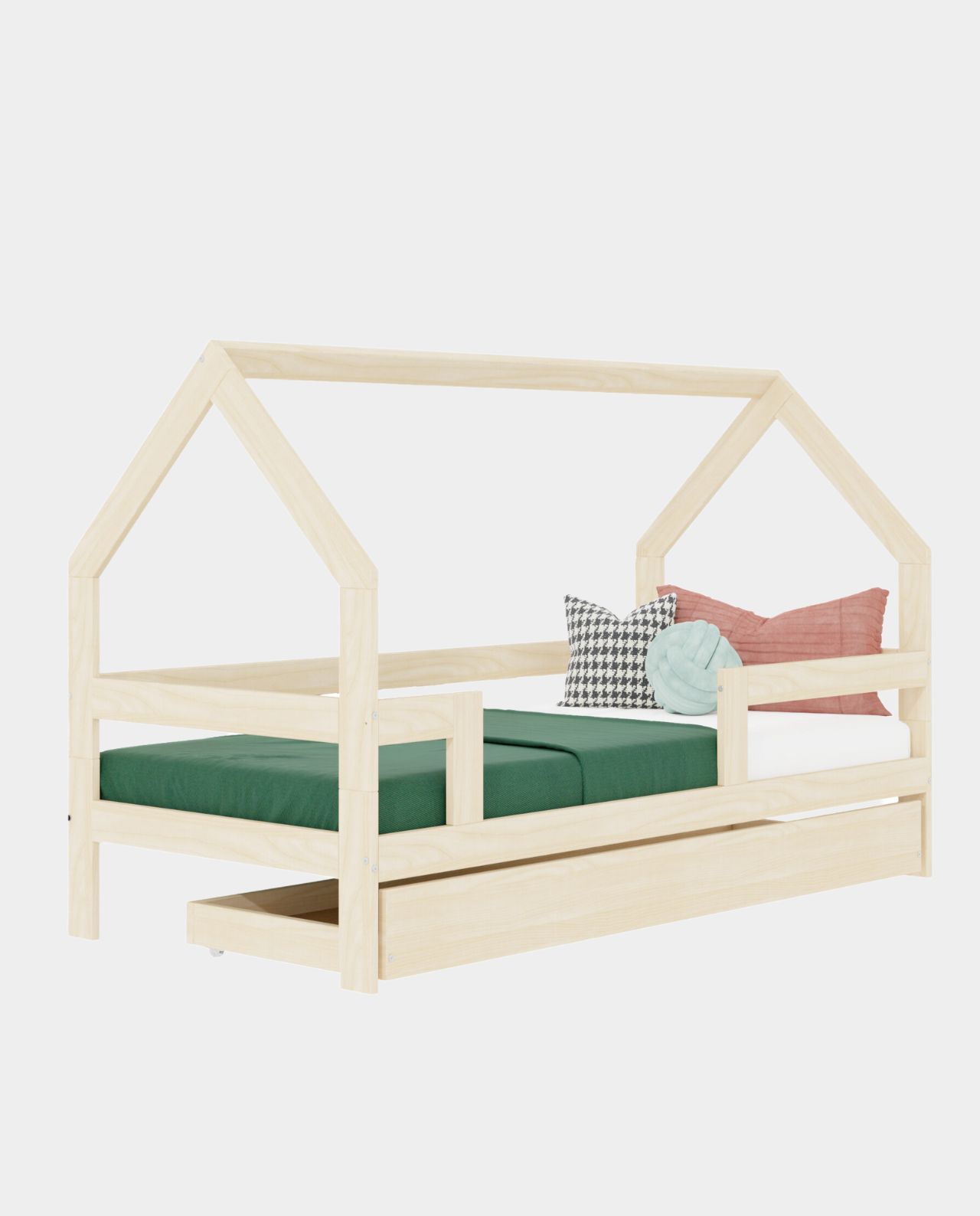 Dieses wundervolle Hausbett mit Rausfallschutz bietet deinem Kind alles was es braucht, um sich nachts richtig wohl zu fühlen. Das Kinderbett ist handgefertigt aus Fichtenholz wahlweise unbehandelt oder in Weiß mit ökologischer Farbe auf Wasserbasis. Der Lack ist auch für Allergiker geeignet. Die Variante Natur ist komplett natürlich und nicht mit Lack behandelt. Das Hausbett kann bis zu 120 kg tragen, so dass auch ein Elternteil zum Vorlesen der Gute-Nacht-Geschichte problemlos mit im Bett liegen kann.