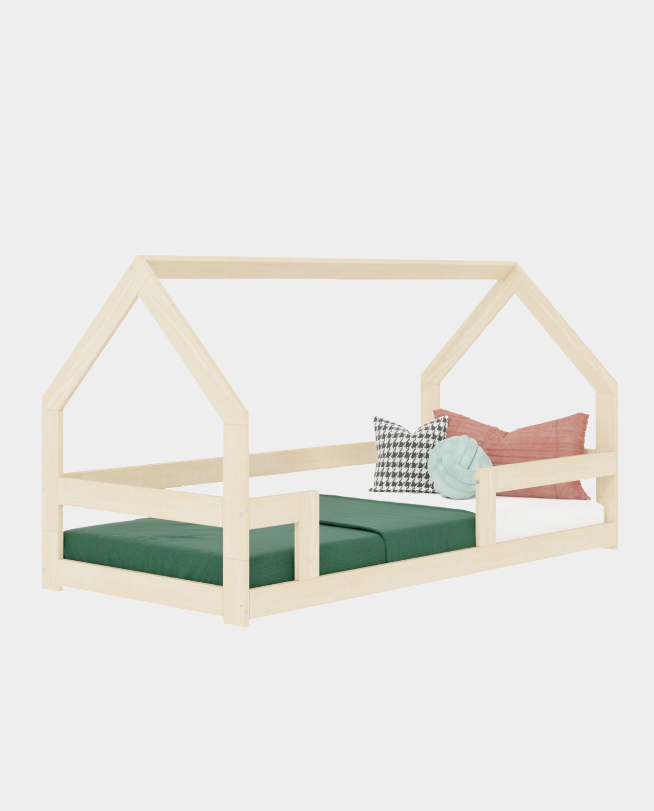 Dieses wundervolle Hausbett mit abnehmbaren Rausfallschutz bietet deinem Kind alles was es braucht, um sich nachts richtig wohl zu fühlen. Das Kinderbett ist handgefertigt aus Fichtenholz wahlweise unbehandelt oder in Weiß mit ökologischer Farbe auf Wasserbasis. Der Lack ist auch für Allergiker geeignet. Die Variante Natur ist komplett natürlich und nicht mit Lack behandelt. Das Hausbett SAFE kann bis zu 120 kg tragen, so dass auch ein Elternteil zum Vorlesen der Gute-Nacht-Geschichte problemlos mit im Bett liegen kann.