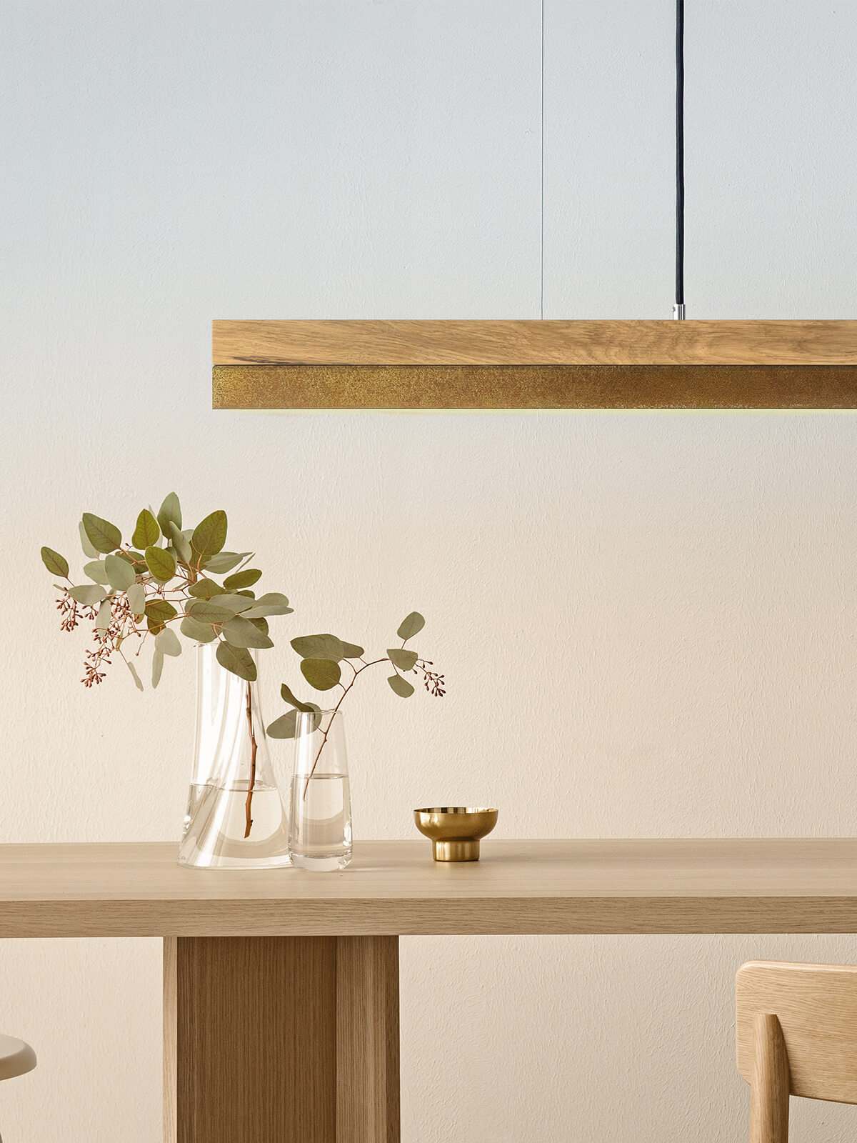 Die hochwertige Hängelampe C-OXI ist eine Kombi aus edlem Eichenholz und oxidiertem Messing, was die Pendelleuchte zu einer zeitlosen und eleganten Designerleuchte macht. Die unterschiedlichen Materialien der Lampenschirme (unterer Teil der Leuchte) lassen sich individuell kombinieren und können jederzeit gewechselt werden.
