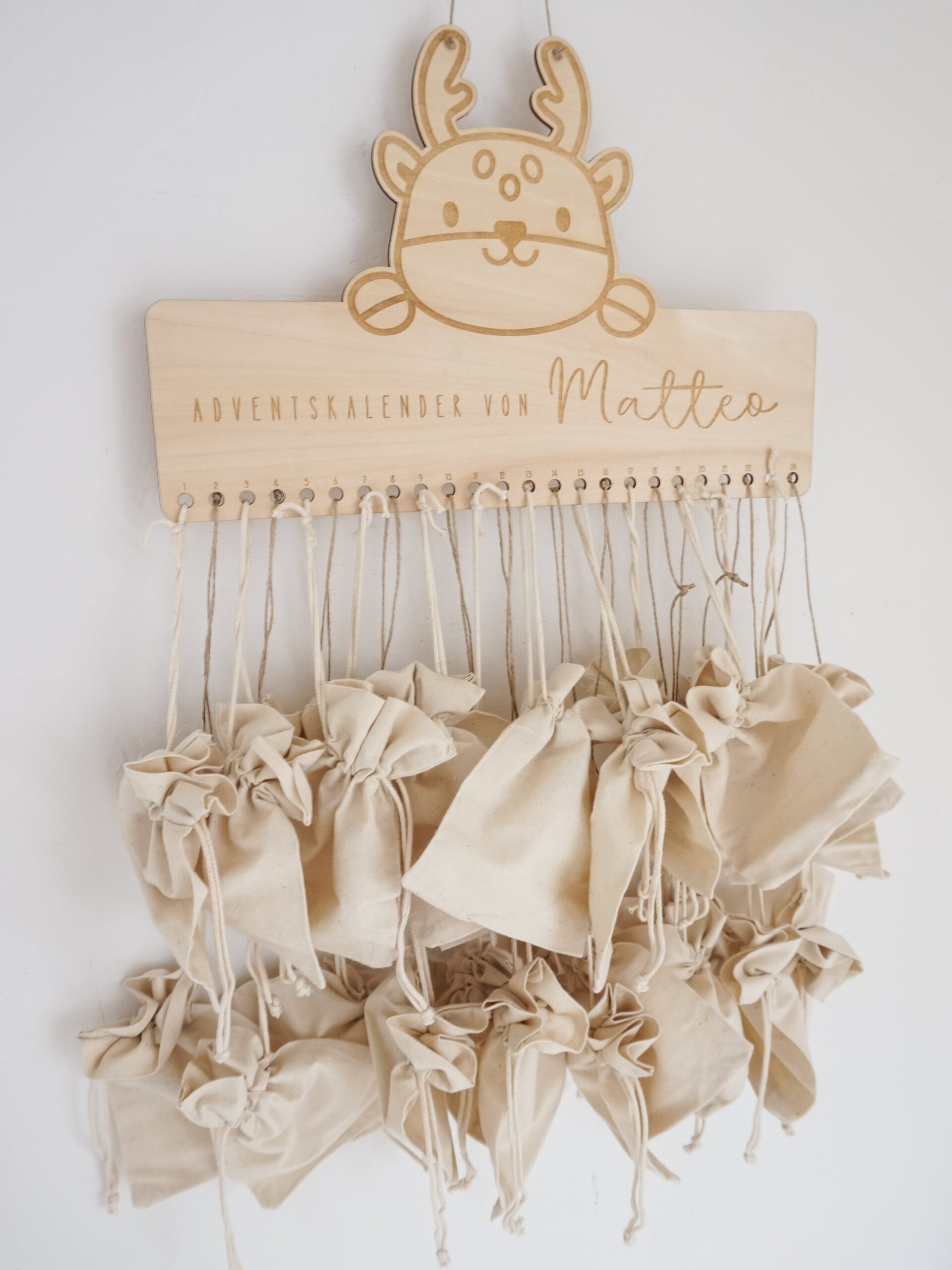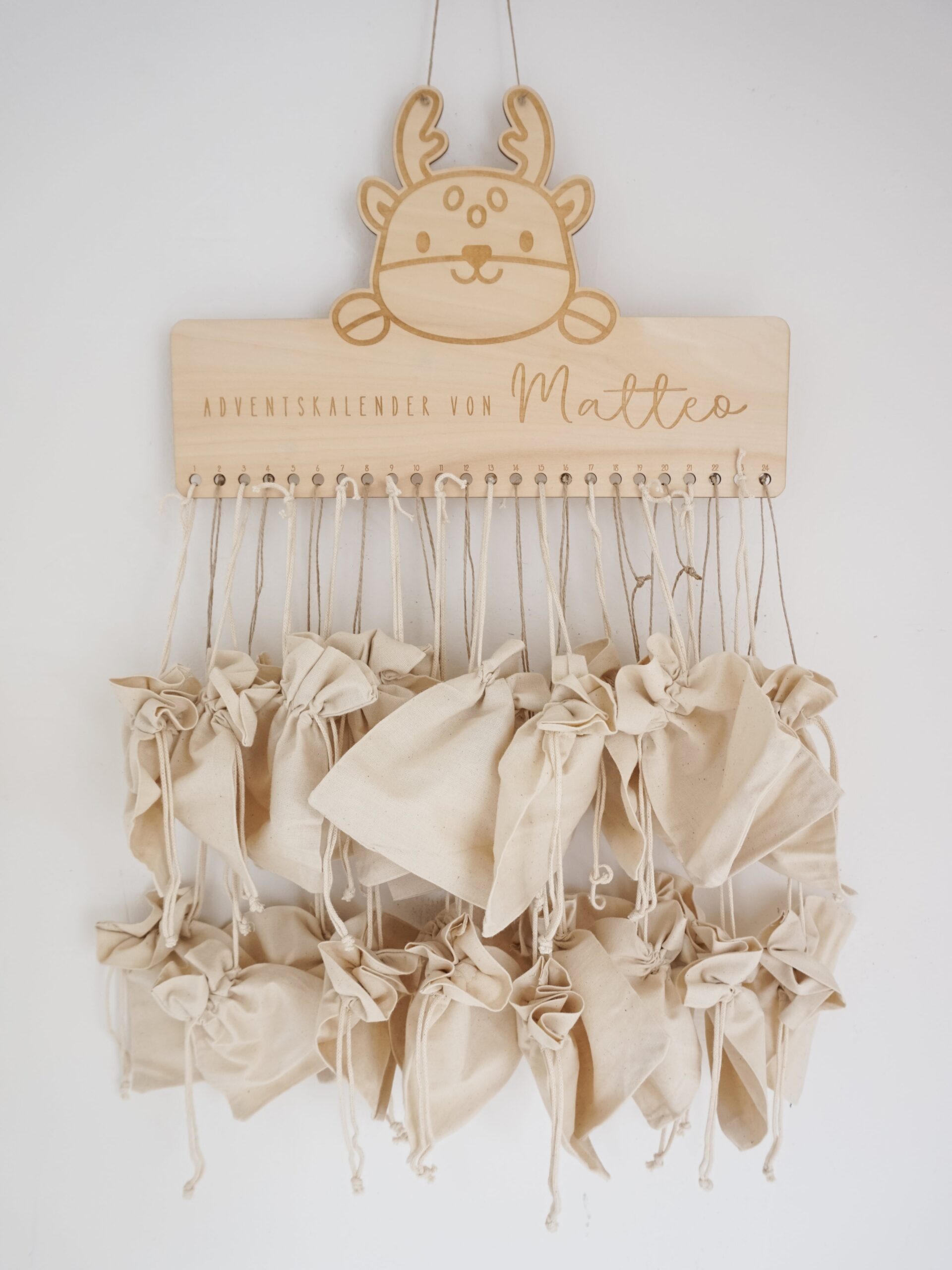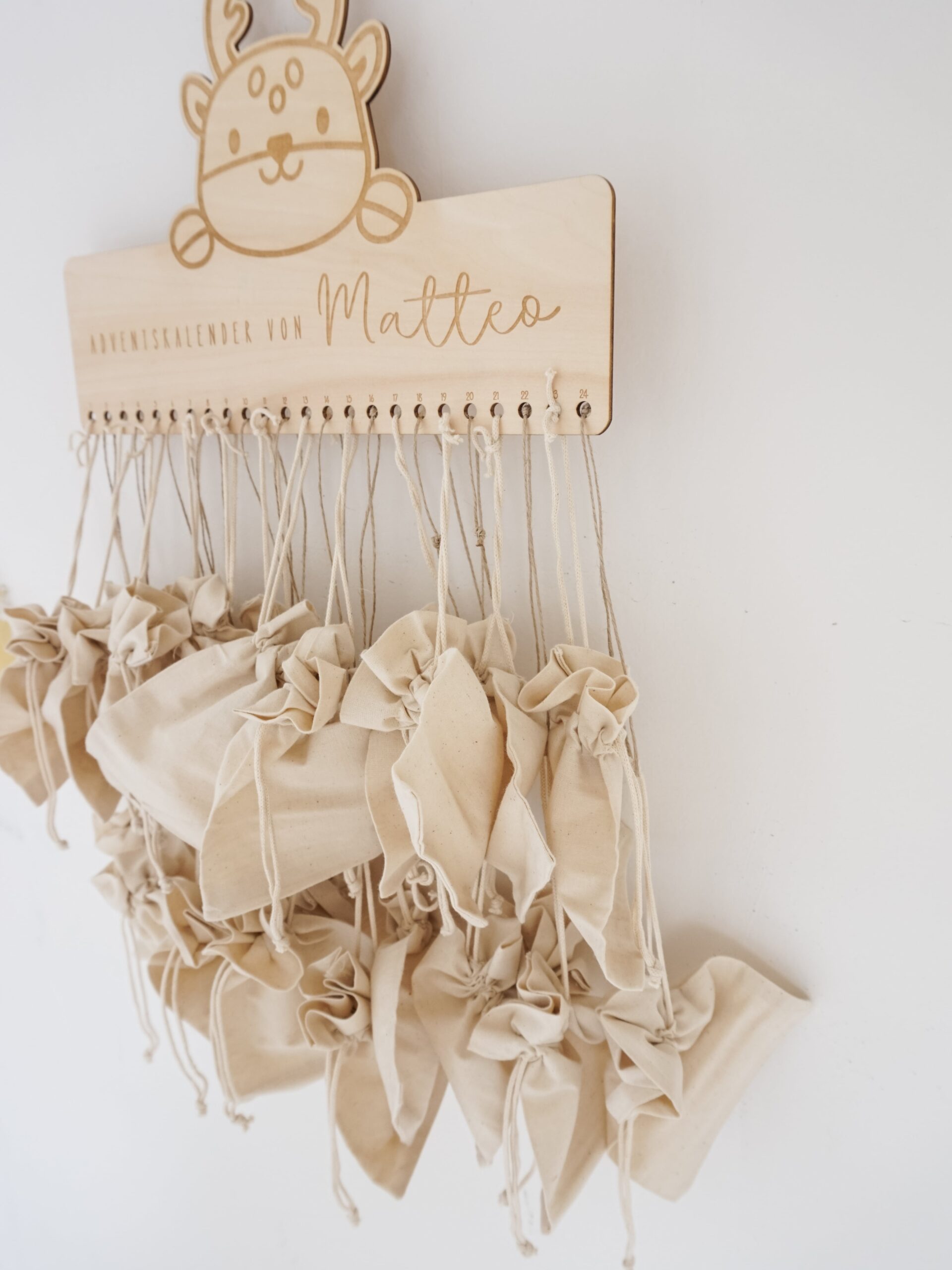 Lass Augen strahlen: Unser liebevoll gefertigter, personalisierter Adventskalender aus Holz wird mit deinem Wunschnamen graviert und begleitet Kinder Jahr für Jahr durch die Vorweihnachtszeit. Wähle je nach Bedarf nur das Holzschild mit Name – oder das komplette Set inkl. 24 Baumwoll-Stoffsäckchen zum Befüllen. Wiederverwendbar, nachhaltig, zeitlos schön.
