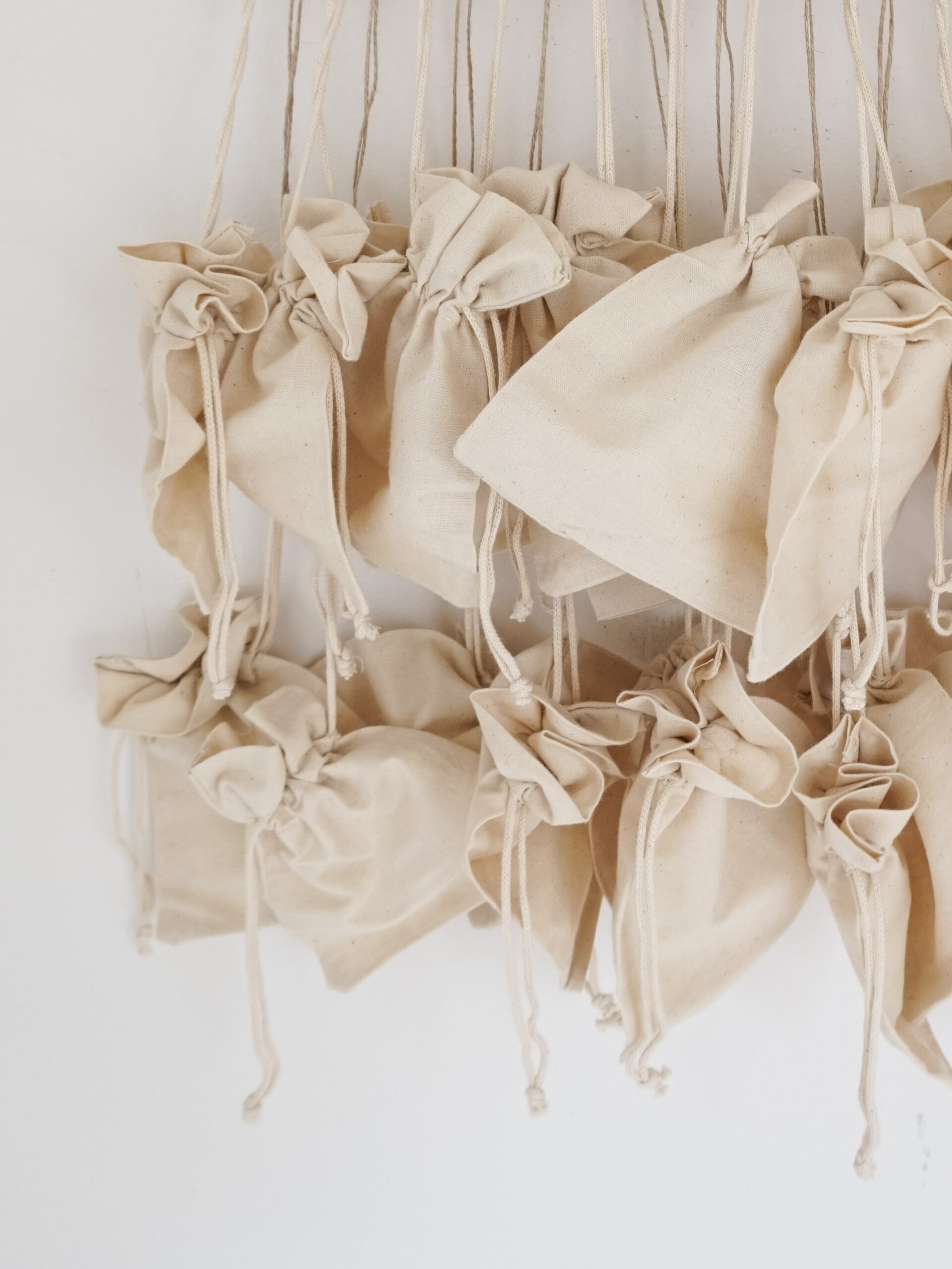 Materialien: Sperrholz (Lasergravur) & Baumwoll-Säckchen; Befestigungsschnüre für die unteren Beutel werden mitgeliefert.