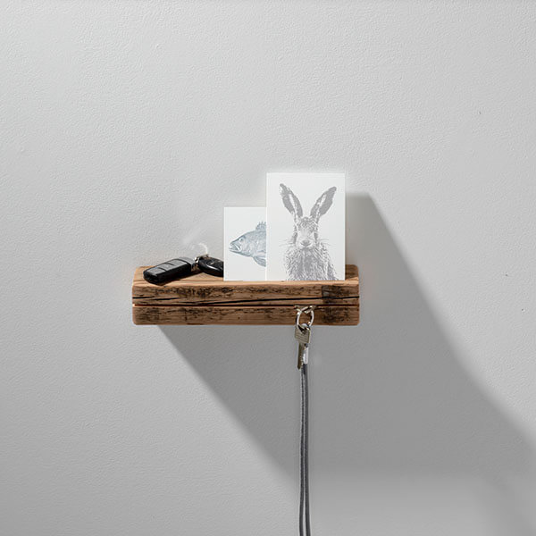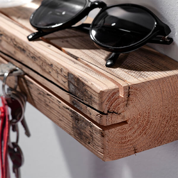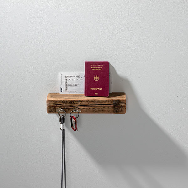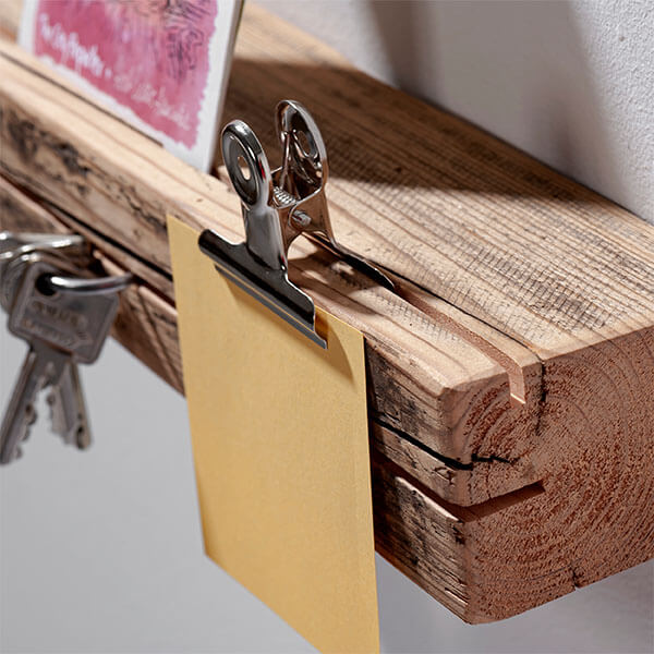 Schlüssel, Portemonnaie, Handy – das Wichtigste für den Gang aus dem Haus findet mit dem Schlüsselbrett OLD WOOD von weld & co seinen Platz. In den Front-Schlitz der kleinen Ablage können Schlüssel und Schlüsselringe gesteckt werden, in der Fräsung an der Oberseite des Schlüsselbretts halten Postkarten, wichtige Briefe, Tickets etc. Außerdem lassen sich mithilfe eines Briefklemmers in der Fräsung Notizen fixieren. Auch Sonnenbrille, Kaffeebecher und Wasserflasche für unterwegs und alle kleinen Gegenstände, die nicht zuhause vergessen werden sollen, können auf dem Schlüsselboard bereitliegen. So wird das Schlüsselbrett zum handlichen „Multifunktionswandregal“ für Eingangsbereich und Flur.
