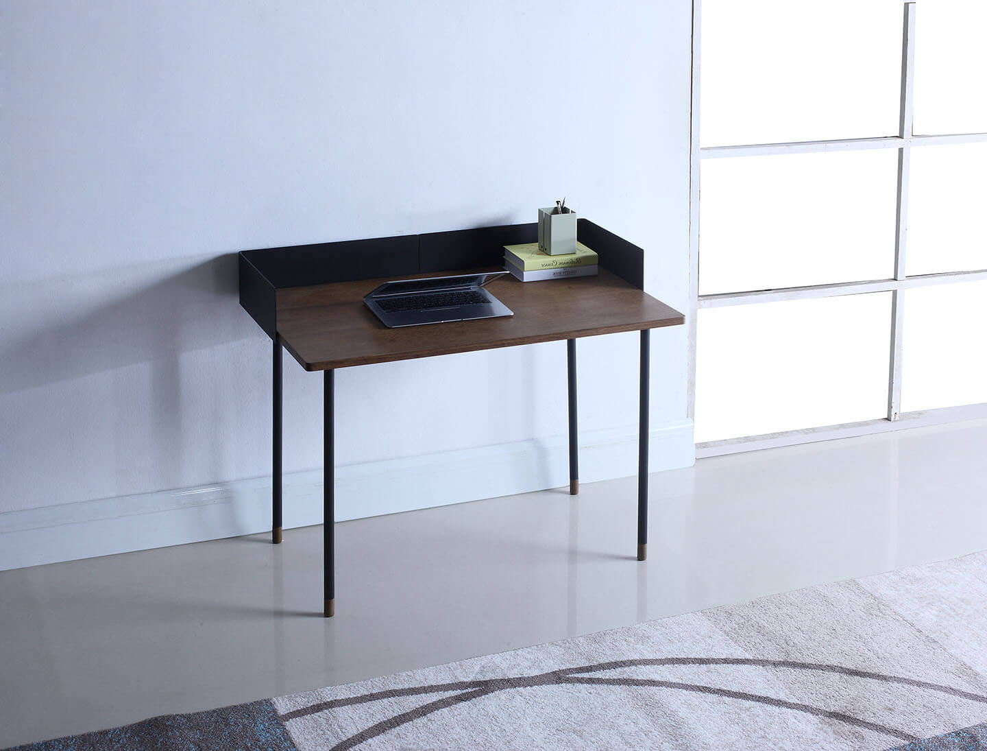 Der Schreibtisch BUENA mit einer Holzplatte aus dunkler Eiche (MDF-Platte mit Massivholzfunier), pulverbeschichteten Beinen und schwarzem Metallrahmen besticht durch sein minimalistisches Design und passt perfekt in jeden Raum. Die schwarzen Metallseiten im Spaltdesign und die Sechskantschrauben unterstreichen den cleanen Charakter. BUENA spart Platz und bietet gleichzeitig genügend Schreibfläche zum Arbeiten und um alle wichtigen Dokumente im Blick zu behalten. Er ist ideal für das Arbeitszimmer, Wohnzimmer oder in einer kleinen Nische im Schlafzimmer und verleiht deinem Zuhause das gewisse Etwas.