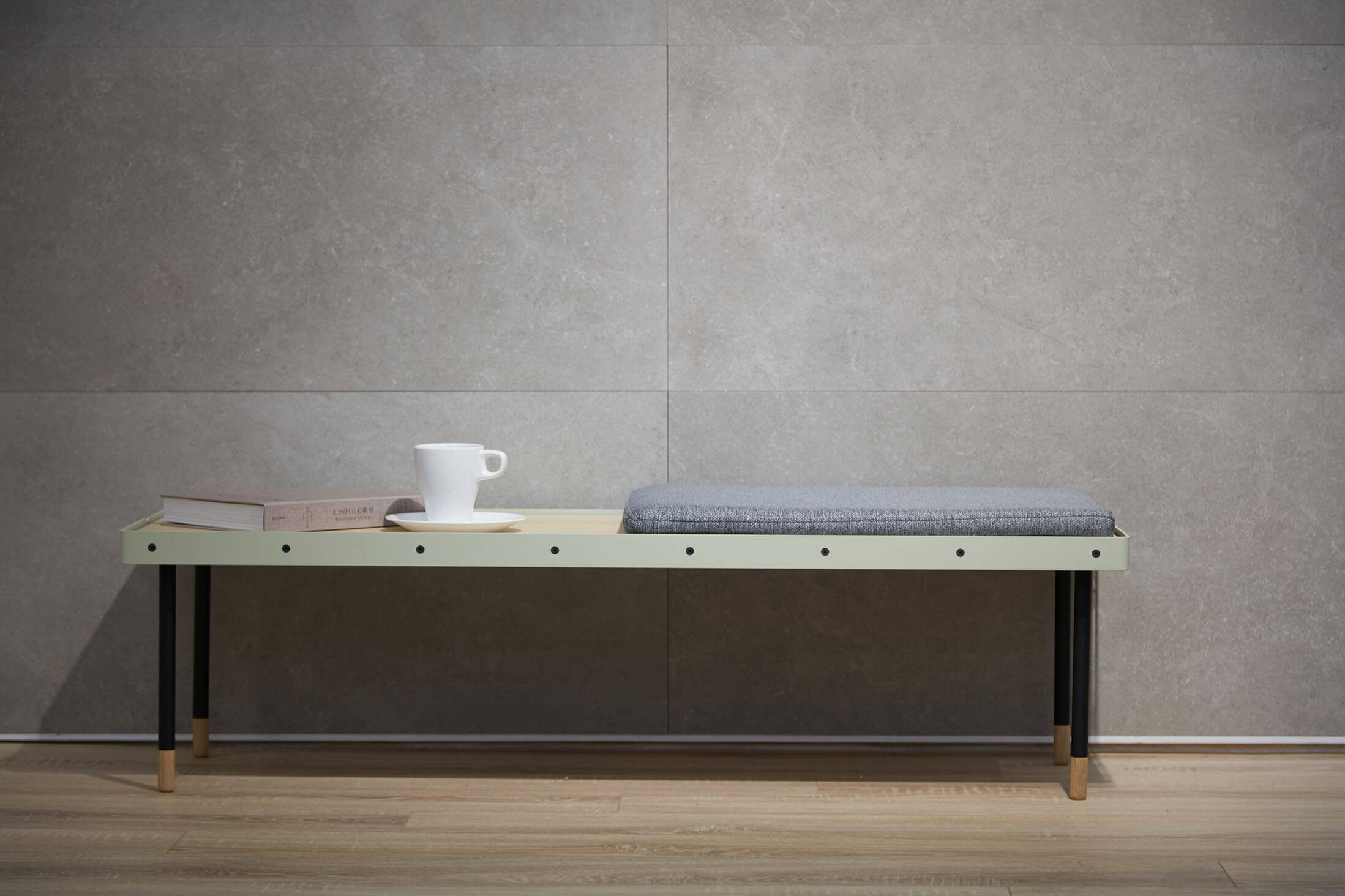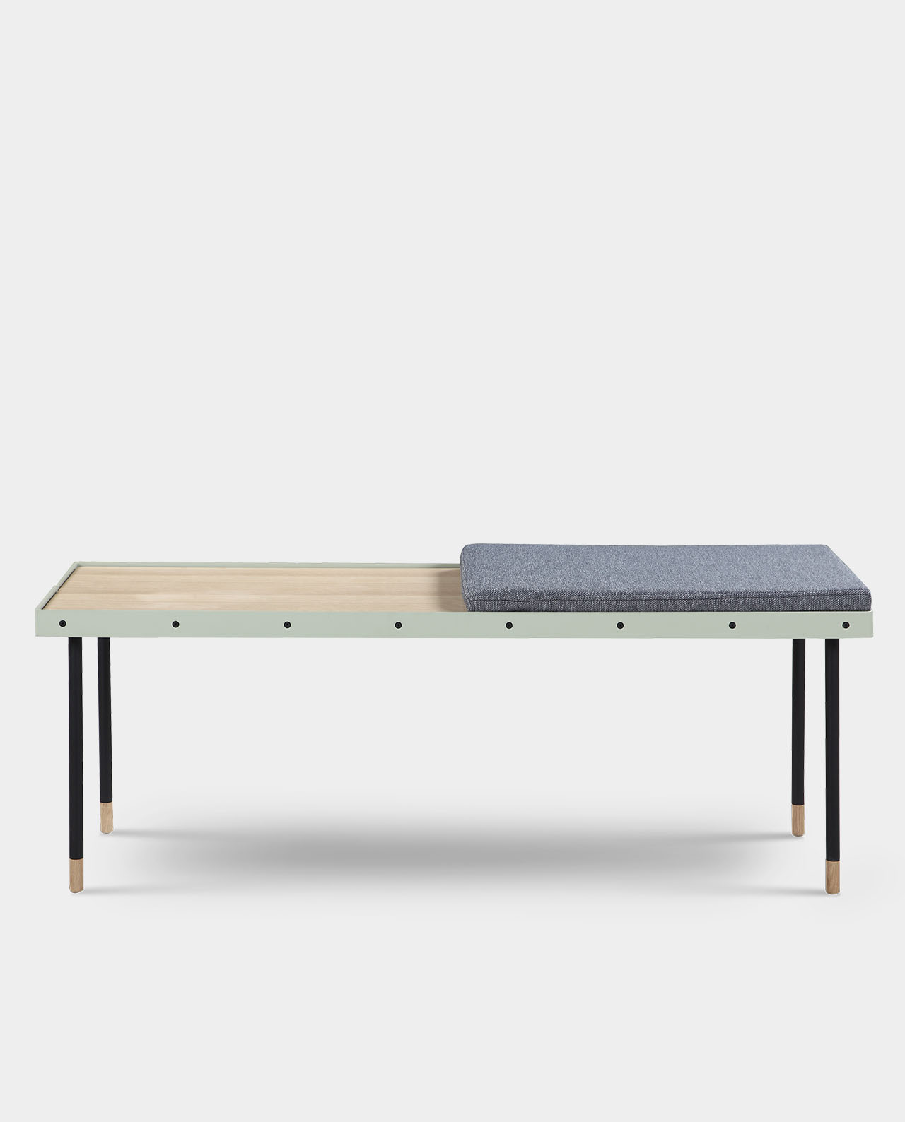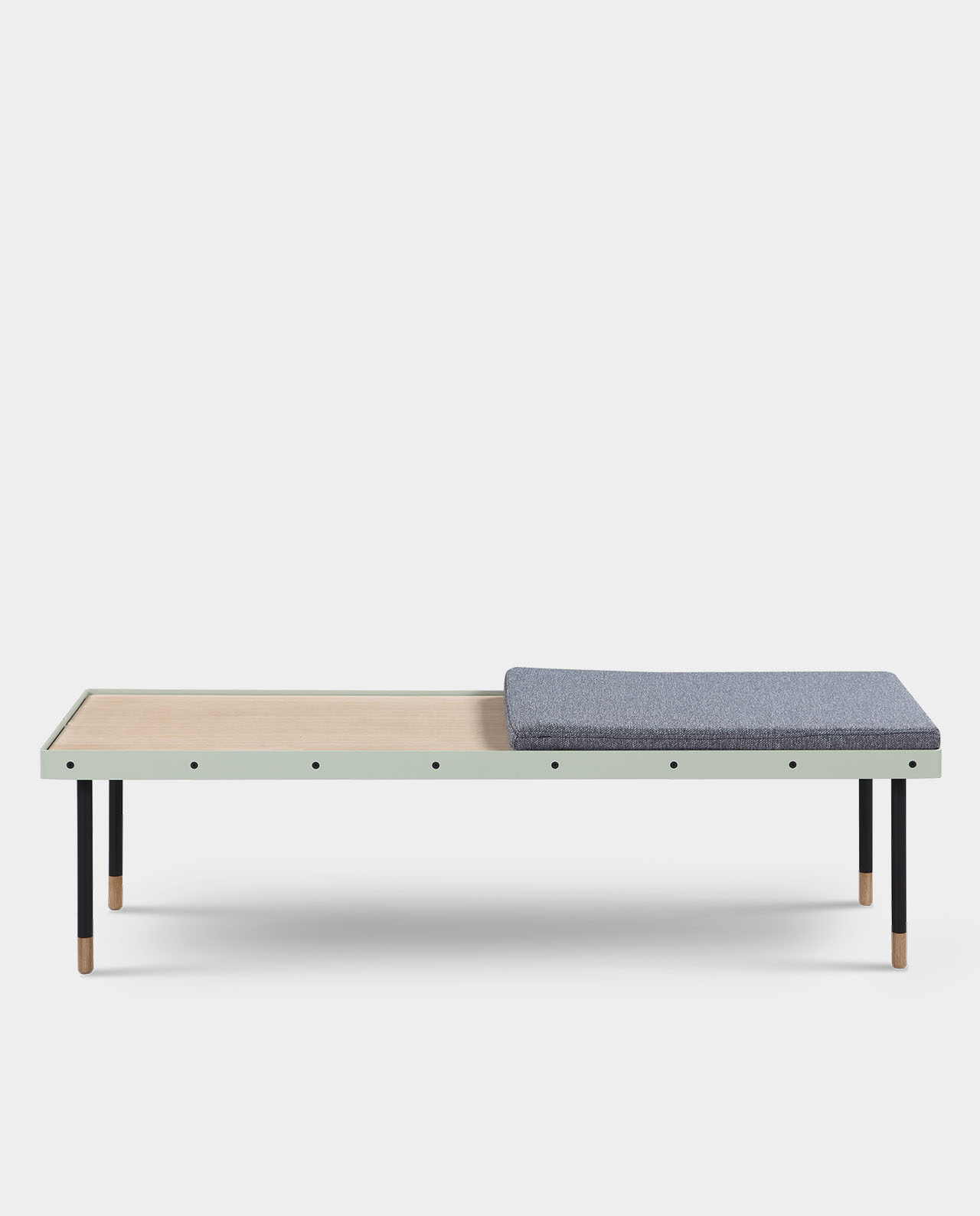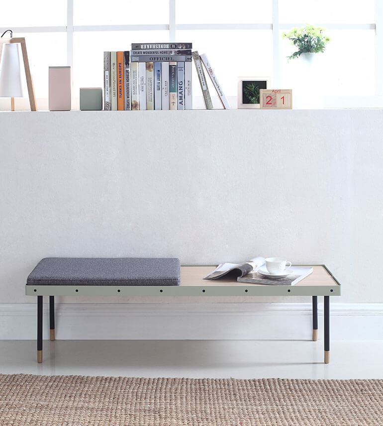 OBISPO ist der Beweis, dass man Pragmatismus, Funktionalität und zeitlose Eleganz in einem Möbelstück vereinen kann. Die Bank ist aus Natureiche gefertigt, verfügt über eine wunderschöne Maserung und wird von einem mintfarbenen Metallrahmen umfasst. Die filigranen Metallbeine nehmen an den Füßen die Eichenoptik wieder auf und runden die zeitlose Ästhetik auf höchstem Niveau ab. Zur Bank gehört ein weiches, graues Stoffkisten, das die Hälfte der Bank je nach Bedarf bedeckt. Hierdurch wird die Bank vielseitig einsetzbar: ob als Ruhebank zum Lesen, als Ablage im Flur oder als moderner Hingucker im Esszimmer – OBISPO passt sich immer den Bedürfnissen an. OBISPO gibt es in zwei verschieden Höhen, die einzeln oder kombiniert verwendet werden können.