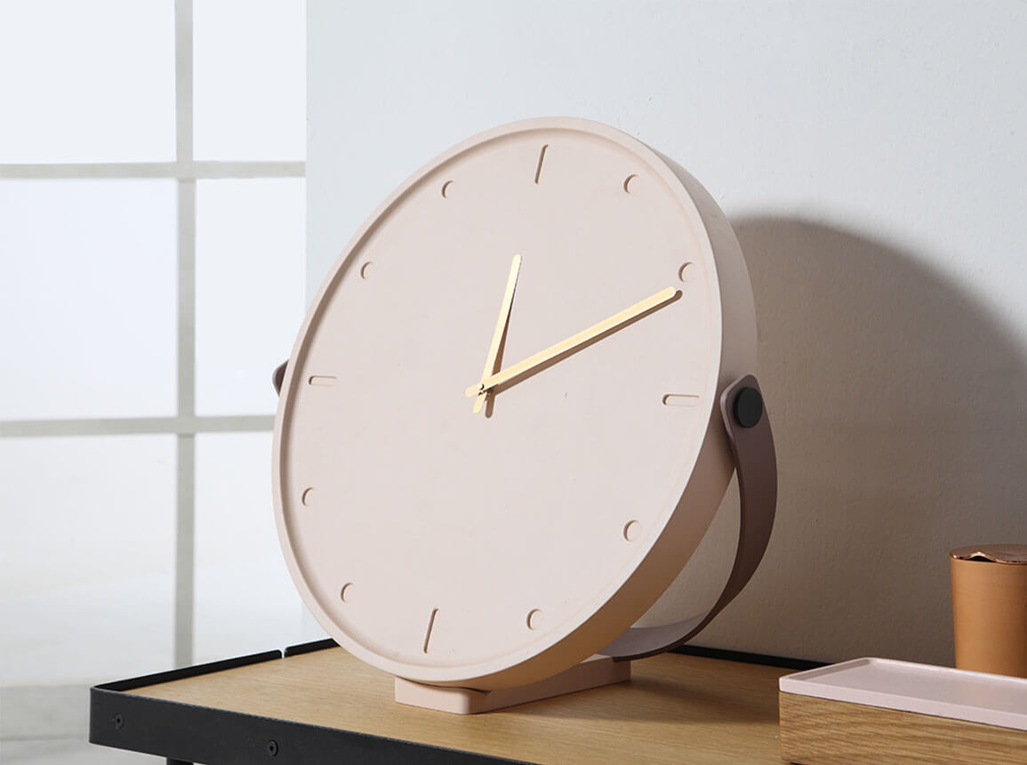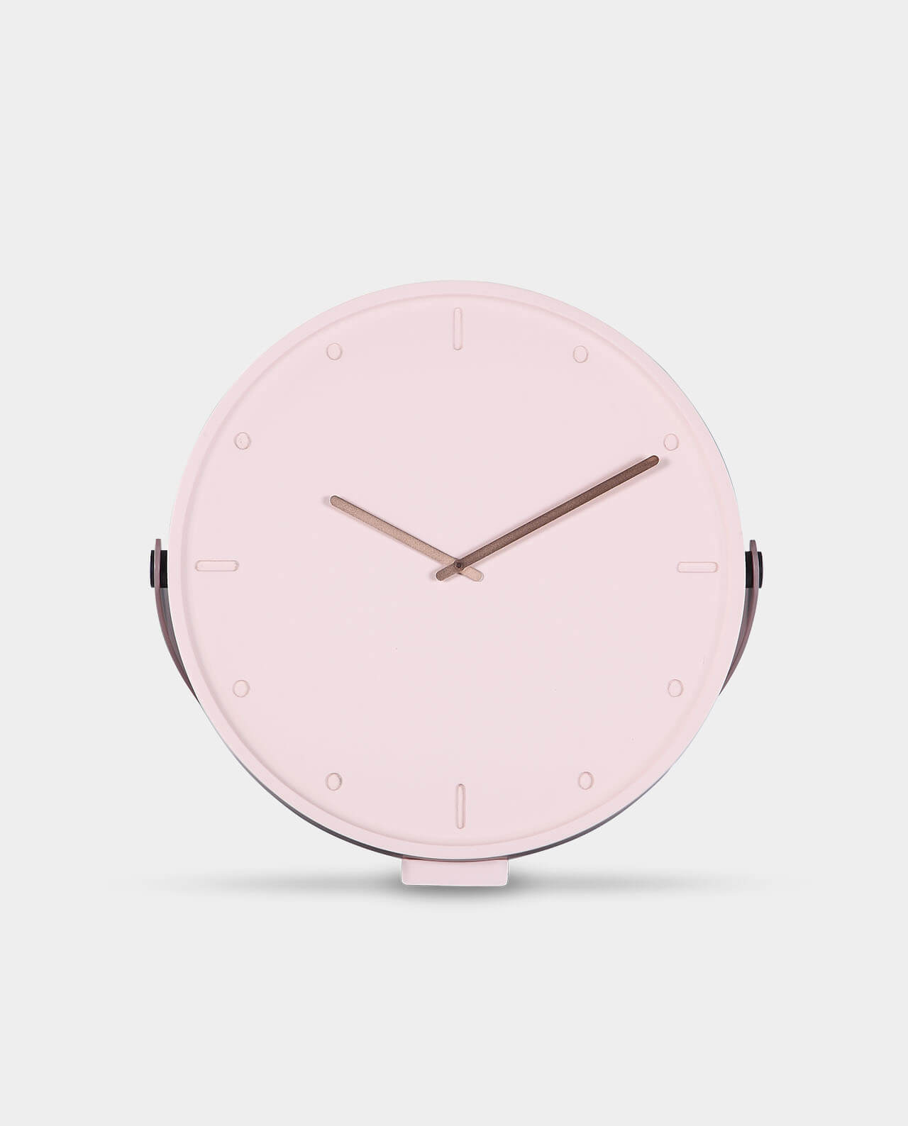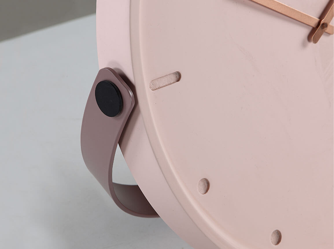 Zeit und Raum neu definieren. Die Designuhr CLARA wurde mit gummierter Farbe in Pastellrosé beschichtet, am Rand beschnitten und mit einem Kupferzeiger komplementiert. CLARA konzentriert sich auf das Wesentliche: die Zeit. Das klare Design spricht für sich und beweist, dass die Einfachheit das Besondere ausmacht. Die Uhr wird mit farblich passenden Sockel geliefert, kann aber auch an der Wand aufgehängt werden. Zwei Positionslöcher für Haken sind vorhanden. Der Ring ist beweglich. Der Durchmesser beträgt 44cm. Die Tiefe liegt bei 4cm. CLARA ist absolut lautlos und eignet sich daher auch hervorragend fürs Büro oder Home Office.